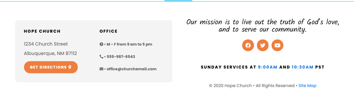 This Section has contact info, mission statement and service times.