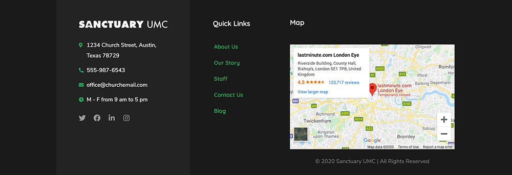 Navigate to Templates Theme Builder click the "Footer" tab Sanctuary | Footer click "Edit with Wordpress."The footer is made of three Columns.