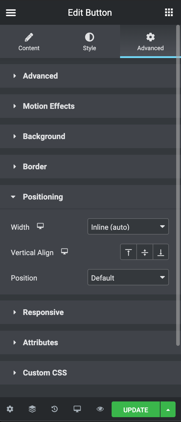 - These buttons are able to be on the same line because we have set them to use "inline" positioning. To make this position change, go to the Advanced Tab, click Positioning, and select "Inline (auto)" from the "Width" drop-down menu.