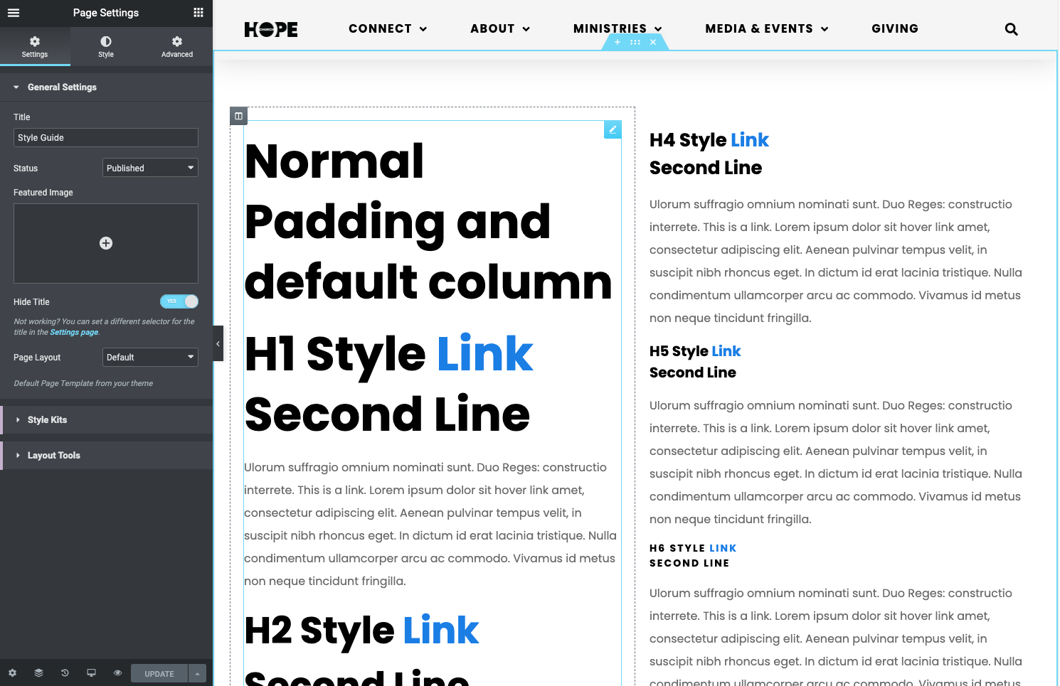 The Style Guide page has been set up with various sections that show examples of all the typography, and button styles, column gaps, and section padding. - Click the top-left "Menu" icon