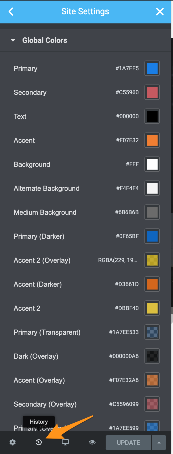 To revert back to a previous Global Style setting, open the "History" menu item and choose the correct version. Note that there is a "History" for each of the Site Settings sub menu's (ie: Global Colors, Global Fonts, etc.)