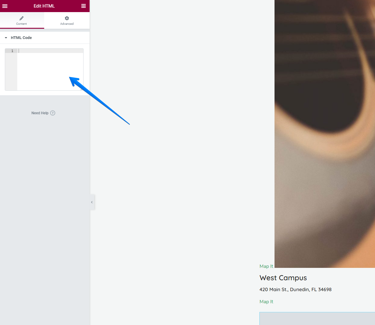 When the HTML widget has been added, you will see the options for that widget in the left sidebar. Add the embed code you received from your ChurchStreaming.tv account in the HTML code field.