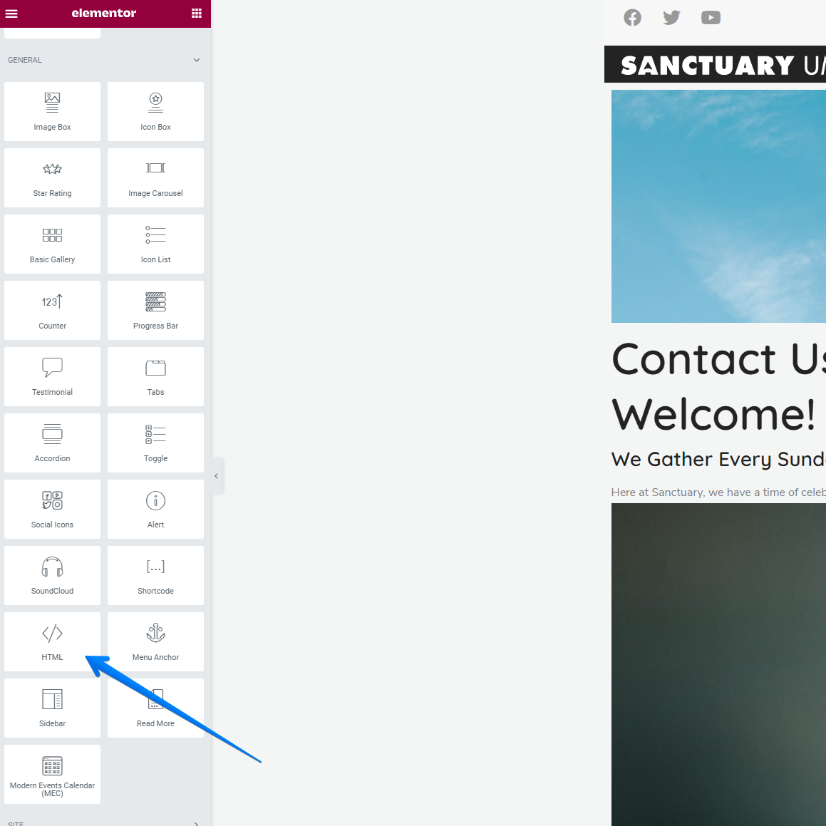 Once you have your embed code, edit the page you would like to add the feed to, and then select the HTML widget from the editor's sidebar and drag and drop it to the area you would like on the page.