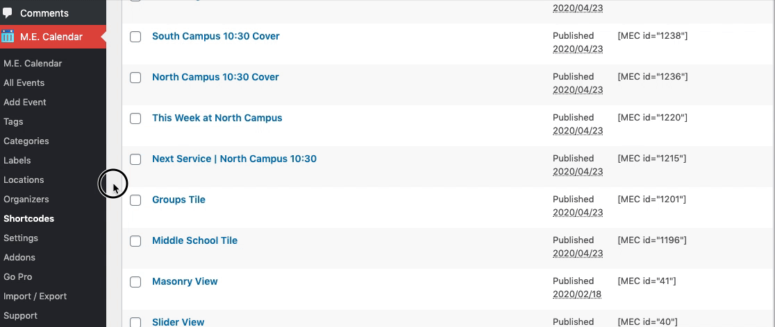 - To create a shortcode, click M.E. Calendar in your Dashboard menu Click Shortcodes Click the "Add Shortcode" button at the top of the content area.