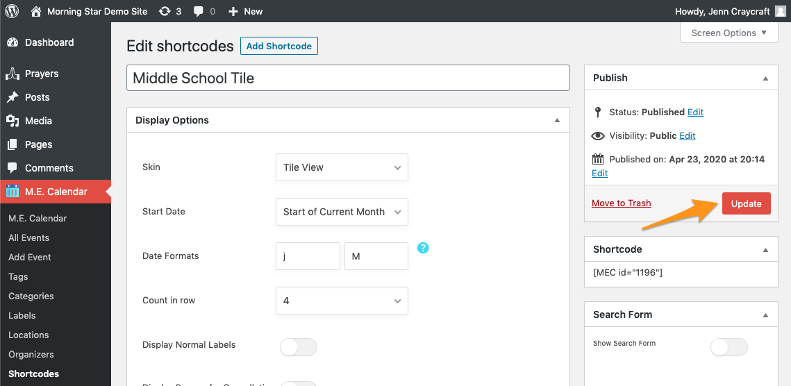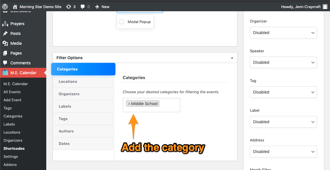 - To add a Category to a shortcode, click M.E. Calendar in your Dashboard menu Click Shortcodes Find the Shortcode you want to edit and click the "edit" link.