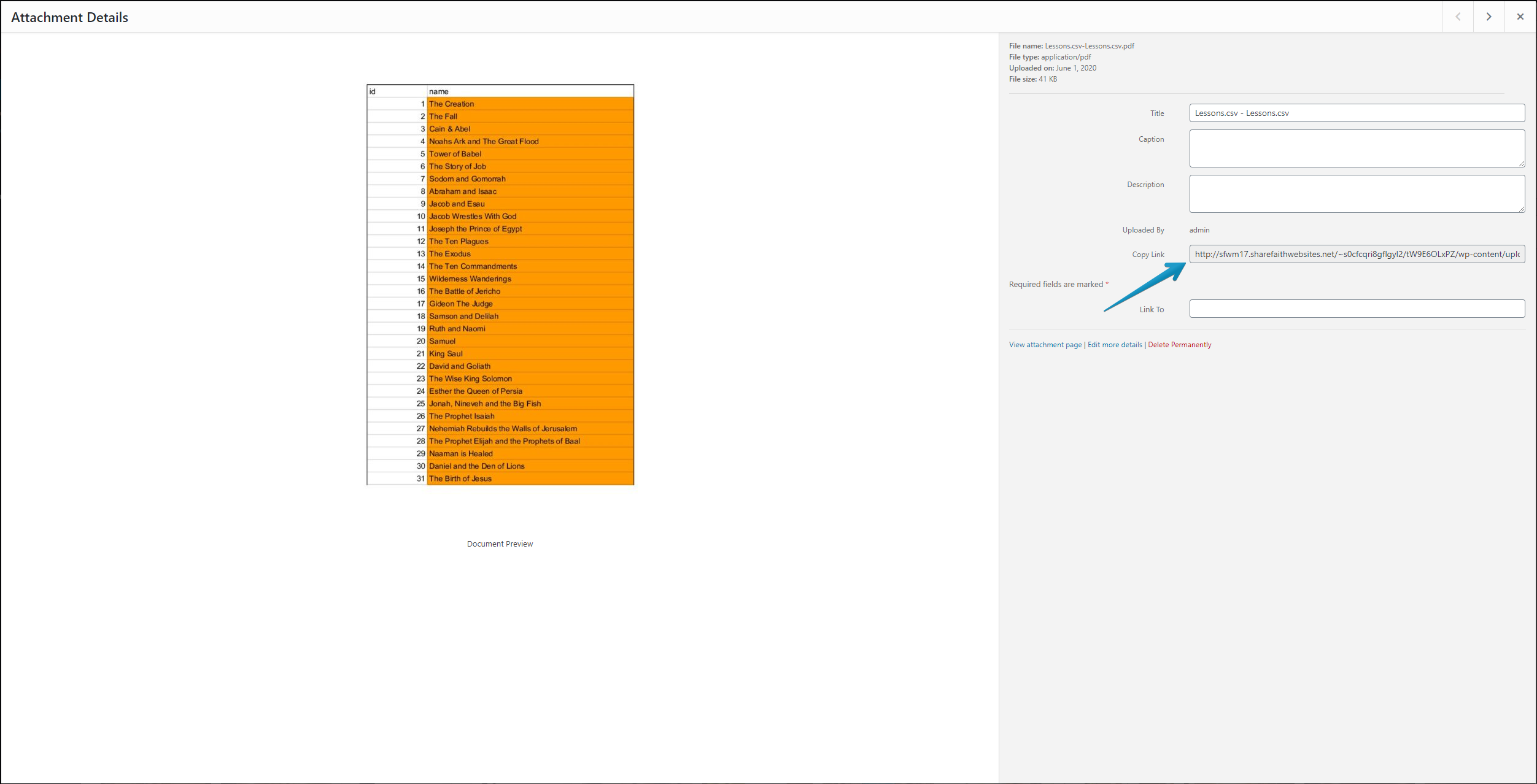- Once the file has been uploaded, select the Media menu option again to view all of your uploaded files and find the PDF file that you just uploaded. Once you have found it, click on the file and then copy the PDF's URL from the Attachment Details screen.