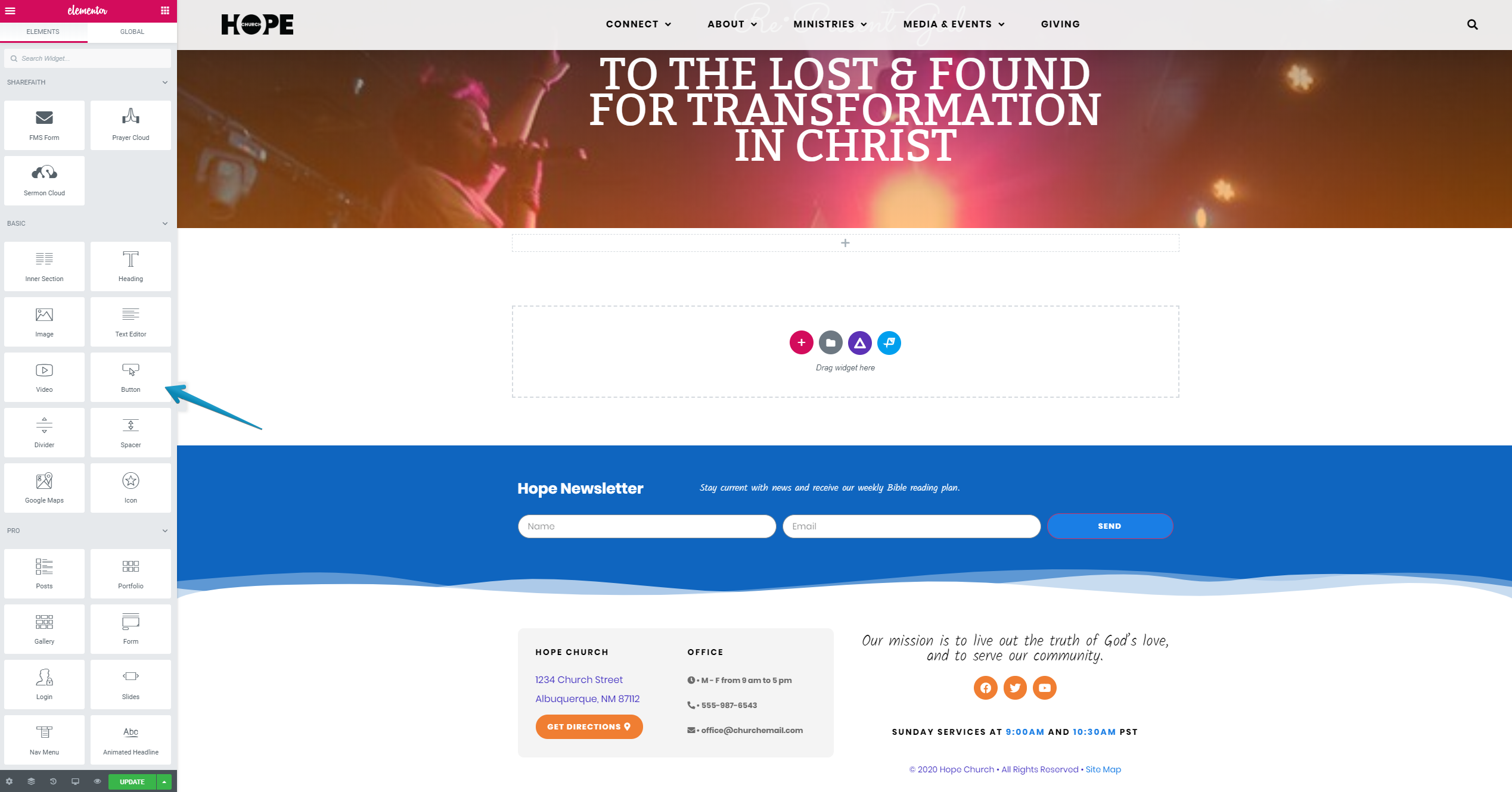 - Now that you have the link for your PDF file, navigate to the page where you would like to add your PDF button and add the Button widget where you would like by dragging it into the desired part of that page.
