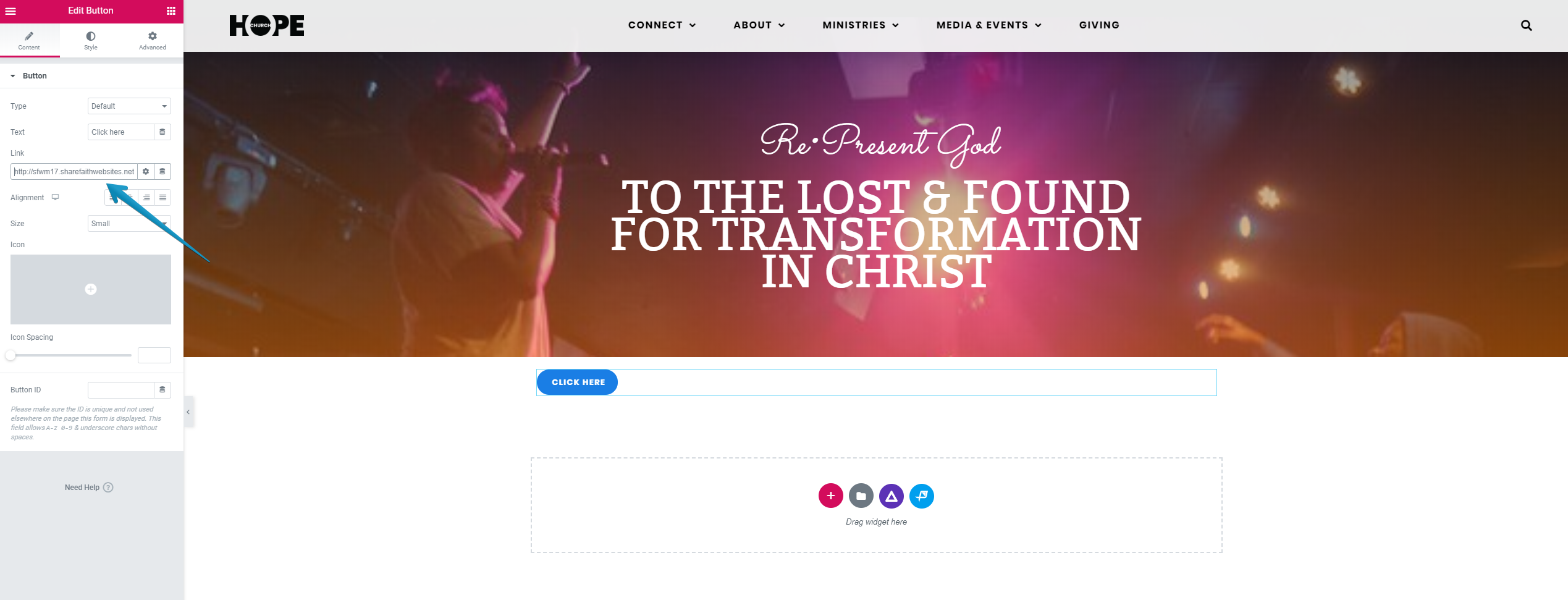 - Once that has been added to your page, paste the link for your PDF into the link field for the Button widget settings.