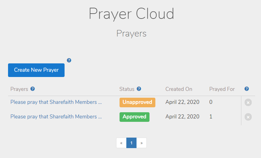 Here, you can view all submitted prayers, their Status, their Creation Date, and how many times they've been Prayed For.