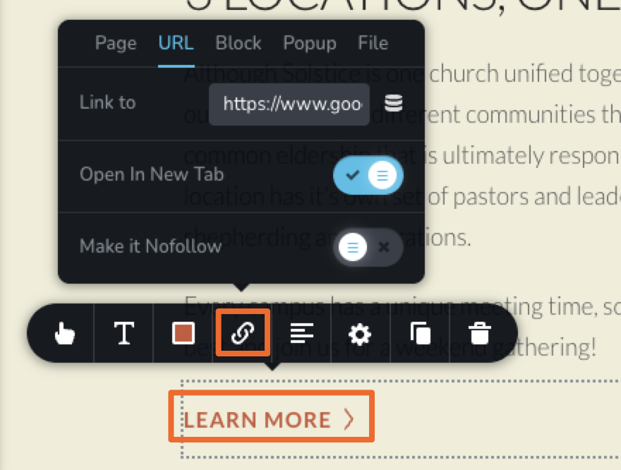 To begin, select a clickable element—such as a button—and open its interaction settings. (In the image below, hovering over "Learn More" allowed the interaction settings to appear.) From the toolbar, choose the link option. A menu will appear with several link types: