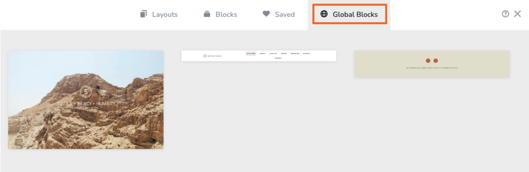 Global blocks can be found in the Block Manager under the Global Blocks tab. All previously created global blocks are listed here and can be added to any page.