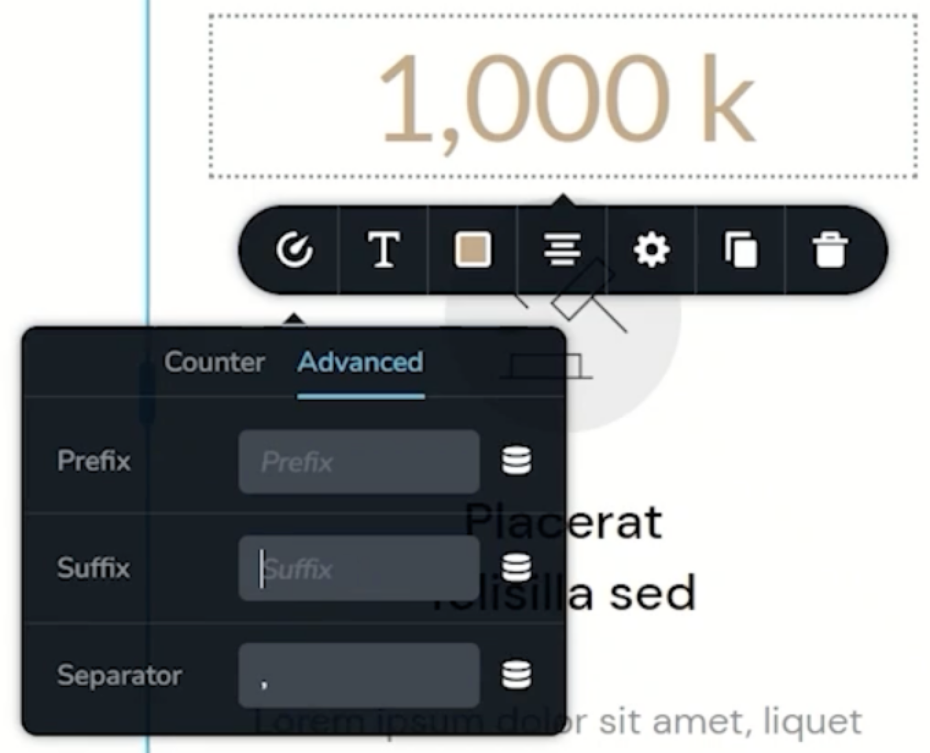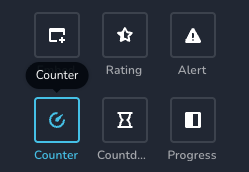 Once placed, select the counter to access its settings via the toolbar on the far left. The default style allows configuration of: